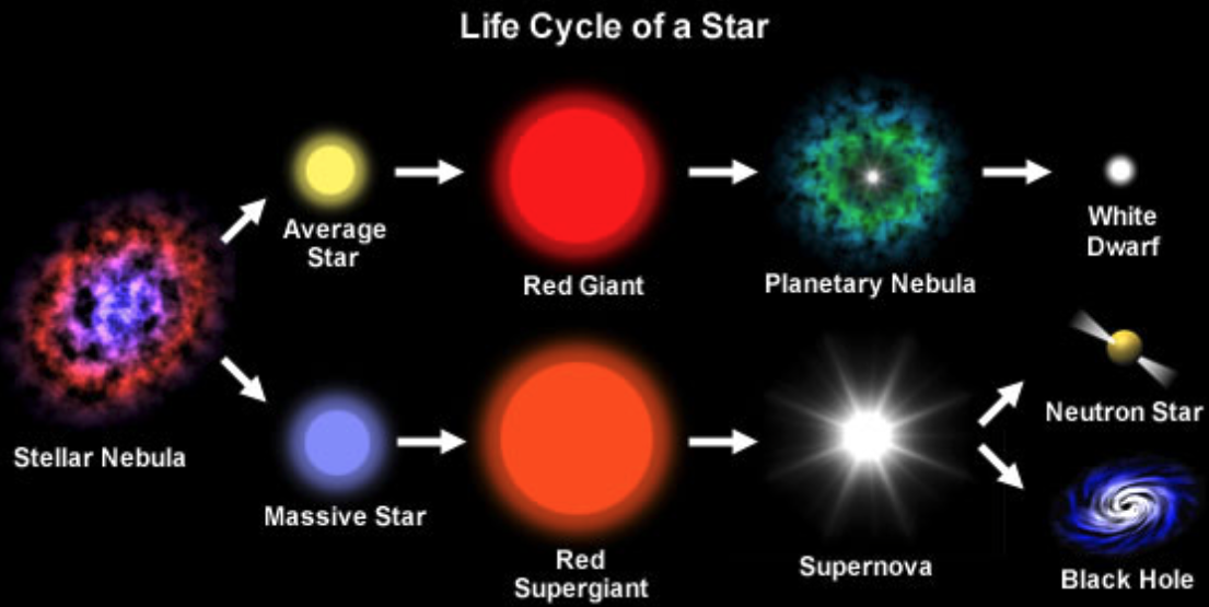 Stars form out of the collapse of clouds of molecular gas. Most stars form in binary systems, with many forming in systems of higher multiplicity, within dense stellar clusters. We refer to a star on the main-sequence, as a star with stable nuclear burning, like our Sun. The main-sequence can be significantly shorter for stars more massive than our Sun. As stars evolve off the main-sequence, their envelopes expand. Our Sun will become a giant star whose envelope extends out to Earth’s orbit. Once burning is complete, the core collapses to form a white dwarf, whilst the outer layers float off as a planetary nebula. For stars significantly more massive than the Sun, this collapse is less gently, leading to violent explosion as a supernova, leaving behind either a compact neutron star or black-hole. Core-collapse supernova occur at the death of stars with masses \(> 8M_\odot\) and can be known as Type II, Ib, Ic. Supernova explosions also occur in white dwarfs where too much material has been added and the electron degeneracy pressure can no longer support the white dwarf against collapse. Type Ia supernovae occur when white dwarfs in binary systems accrete material from their companion.