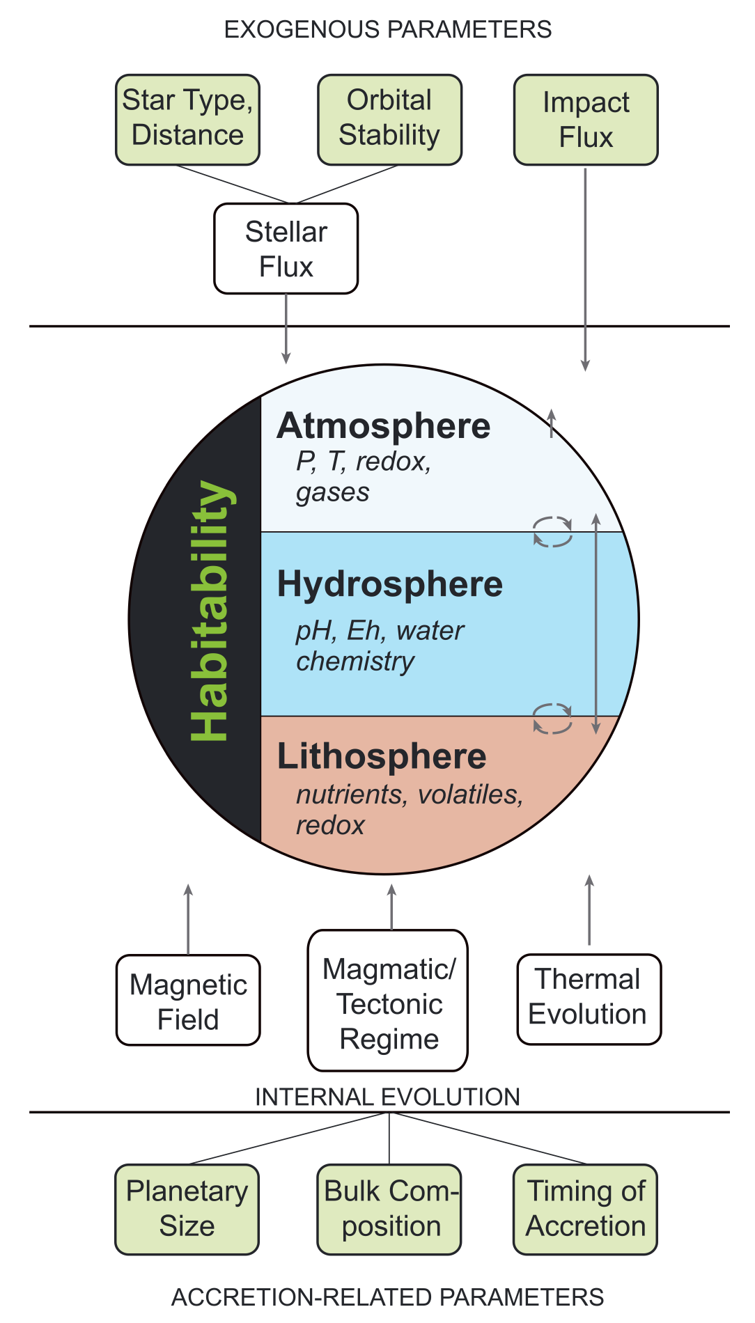 Fig. 1.18 A summary of how interacting factors, from planetary environment, planet formation history, and its internal processes affect planetary habitability. From Ehlman+2016.#