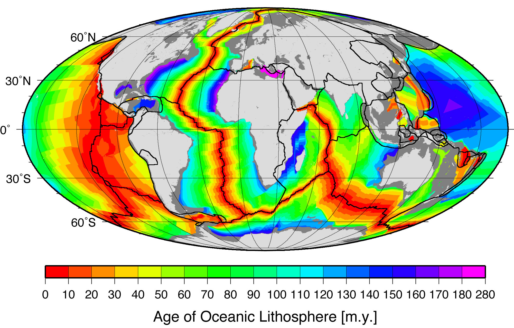 Fig. 1.13 A map of Earth’s seafloor age. From Müller+2008.#