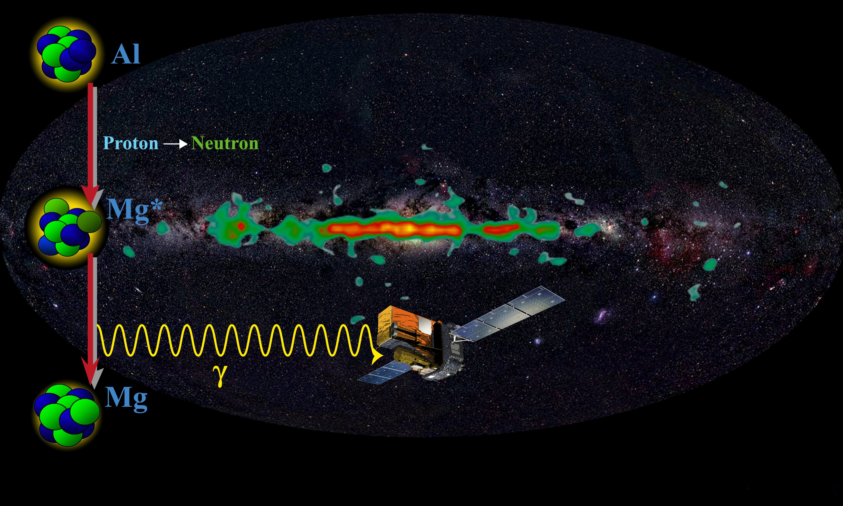 Fig. 2.64 A schematic of the decay sequence of \(\mathrm{^{26}Al}\) and a map of its associated gamma ray emission throughout the galaxy. Emission is notably concentrated towards the galactic midplane and peaks towards the galactic centre, both regions where star formation rates are higher. Image credit: R. Diehl, MPE, Germany.#