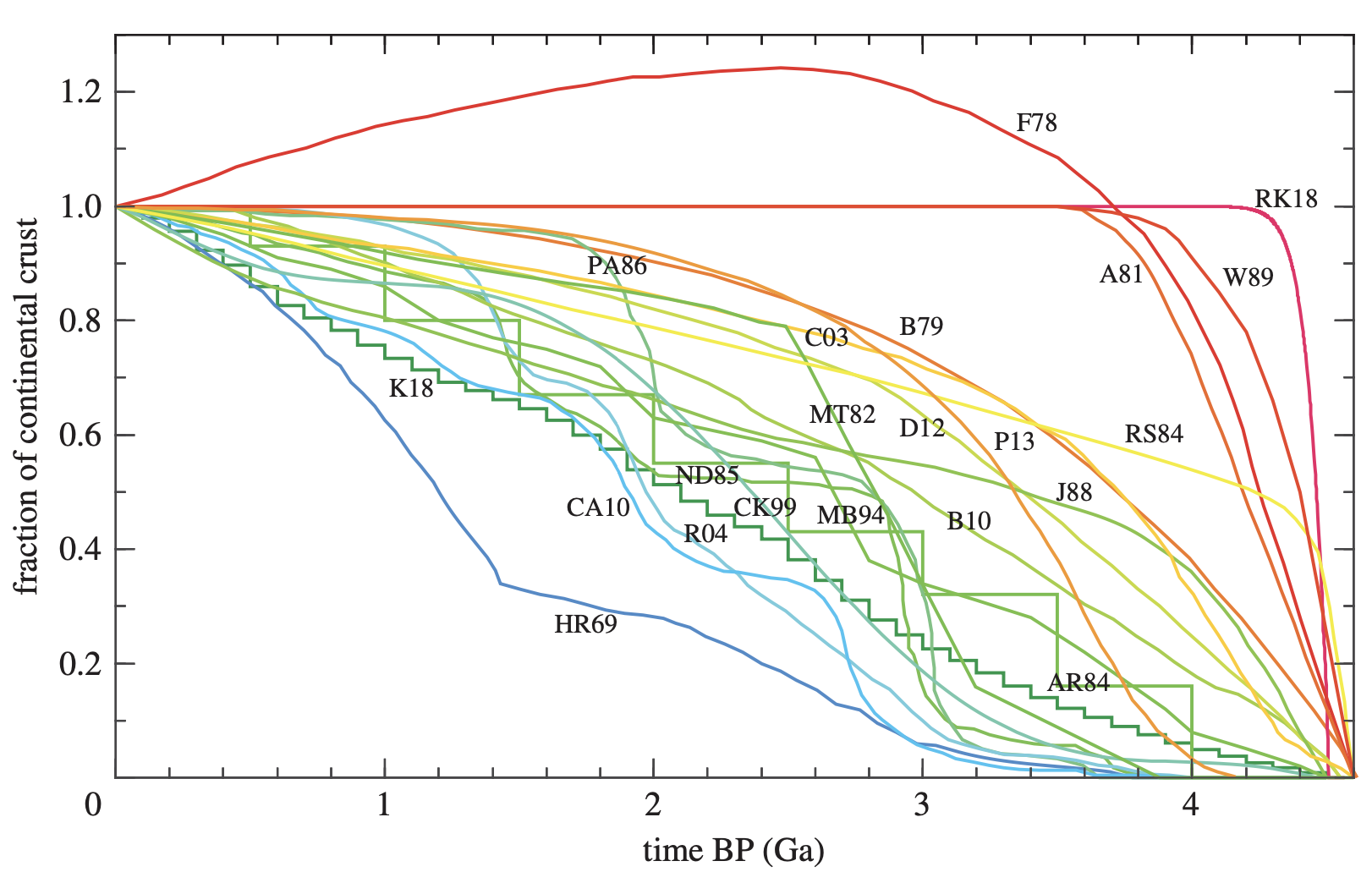 Fig. 2.68 A classic way to look at the evolution of Earth’s continental crust is to plot the fraction that existed (typically a mass fraction normalised to its present mass, as here) as a function of time. Clearly there is wild disagreement about when the substrate for most life on Earth arose. Some models even posit a higher continental crustal mass in the past compared with today. From Korenaga, 2018.#