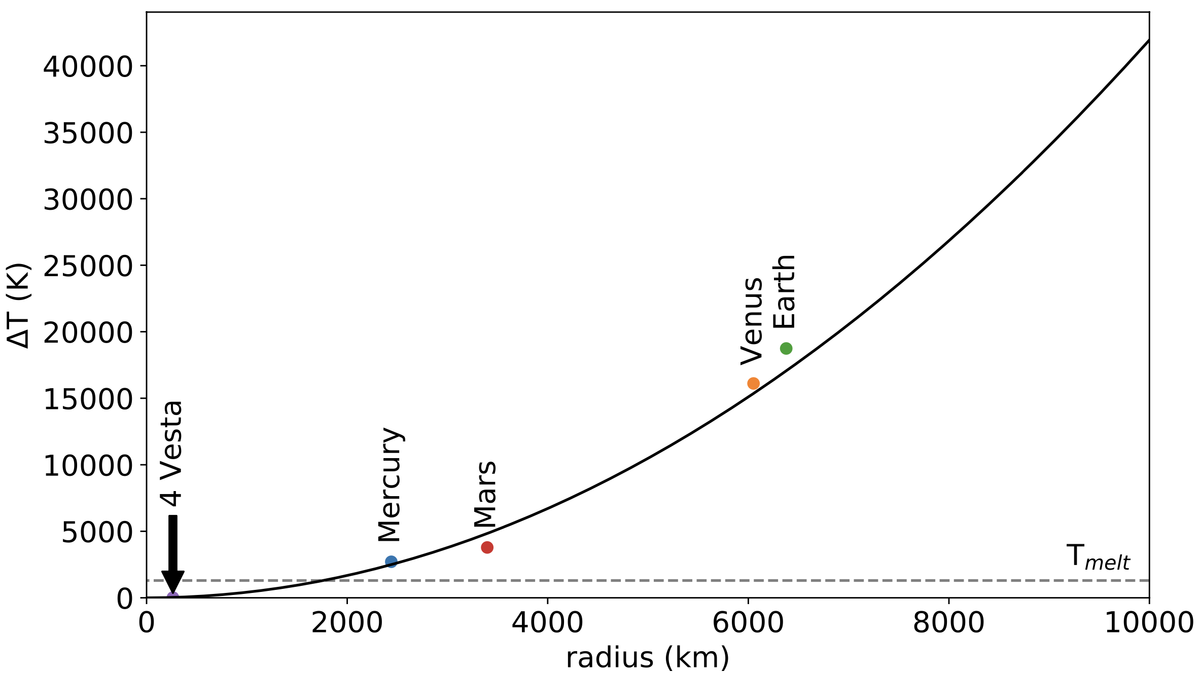 An important observation from Fig. 2.63 is that if we assume melting should not take place until \(\Delta T =1500\,\mathrm{K}\), then only bodies exceeding 1500 km should melt. This is nearly the size of Mercury. However, we see much smaller differentiated objects in the solar system, a prominent example being 4 Vesta, which has a radius of 262.7 km.