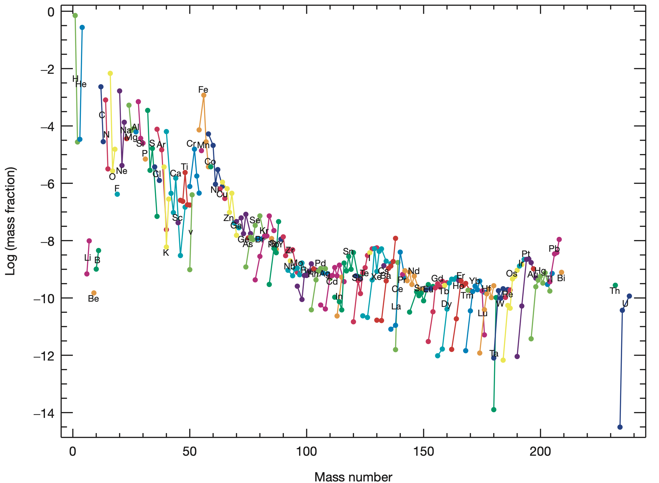Fig. 2.61 The major differentiation episode planets experience is driven by segregation of (dominantly) Fe-metal to form their core. This is possible because of the nuclear stability of iron, resulting in its accumulation during nucleosynthesis and comparatively high abundance for an element of its atomic mass. This is visible in the figure here, plotting the abundance by mass of isotopes present in solar system matter according to their atomic mass. From Heger+2014.#
