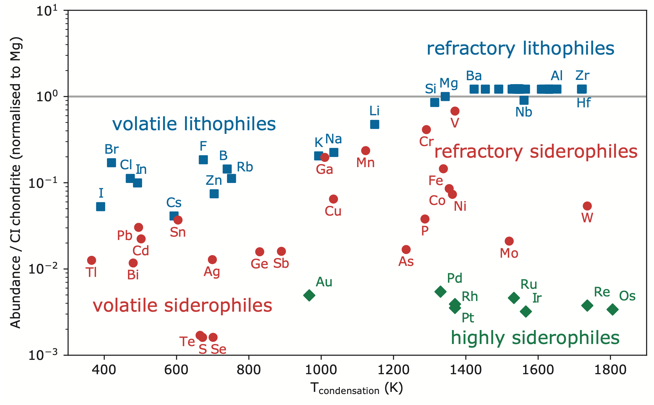 Fig. 2.65 The fingerprint of core formation in the Earth. The abundance of elements in the Earth’s mantle normalised to the element’s abundance of the element in the sun (with secondary normalisation to Mg to account for Earth’s lack of \(\mathrm{H_2}\), as a function of the half mass condensation temperature of the element. Elements with an affinity for metal, siderophile elements, are strongly depleted. From Guimond+ 2024.#
