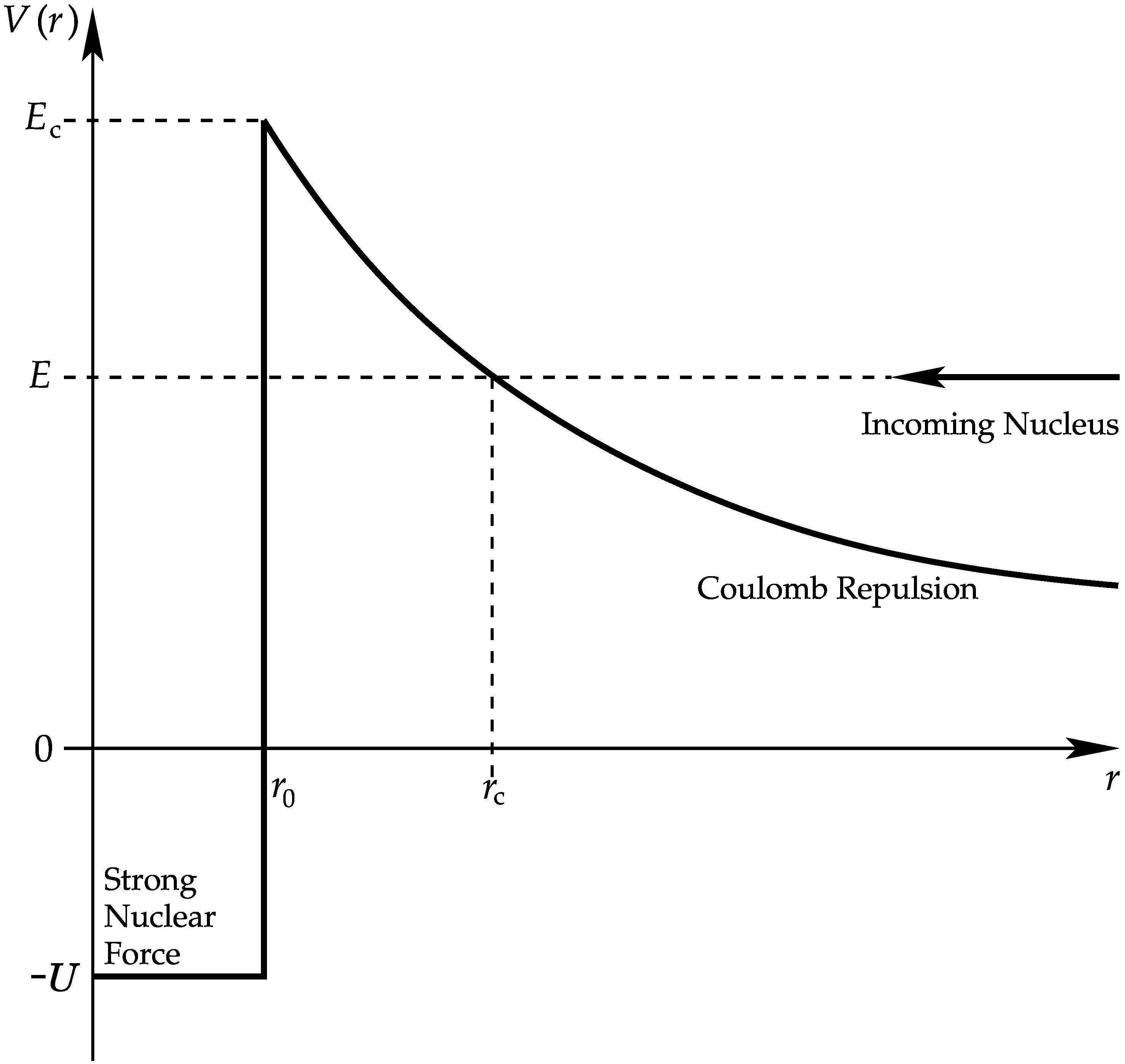 The classical Coulomb barrier could only be overcome if \(E > E_{\rm c}\). The radius at which \(E = V (r > r_0)\) is \(r_{\rm c}\).