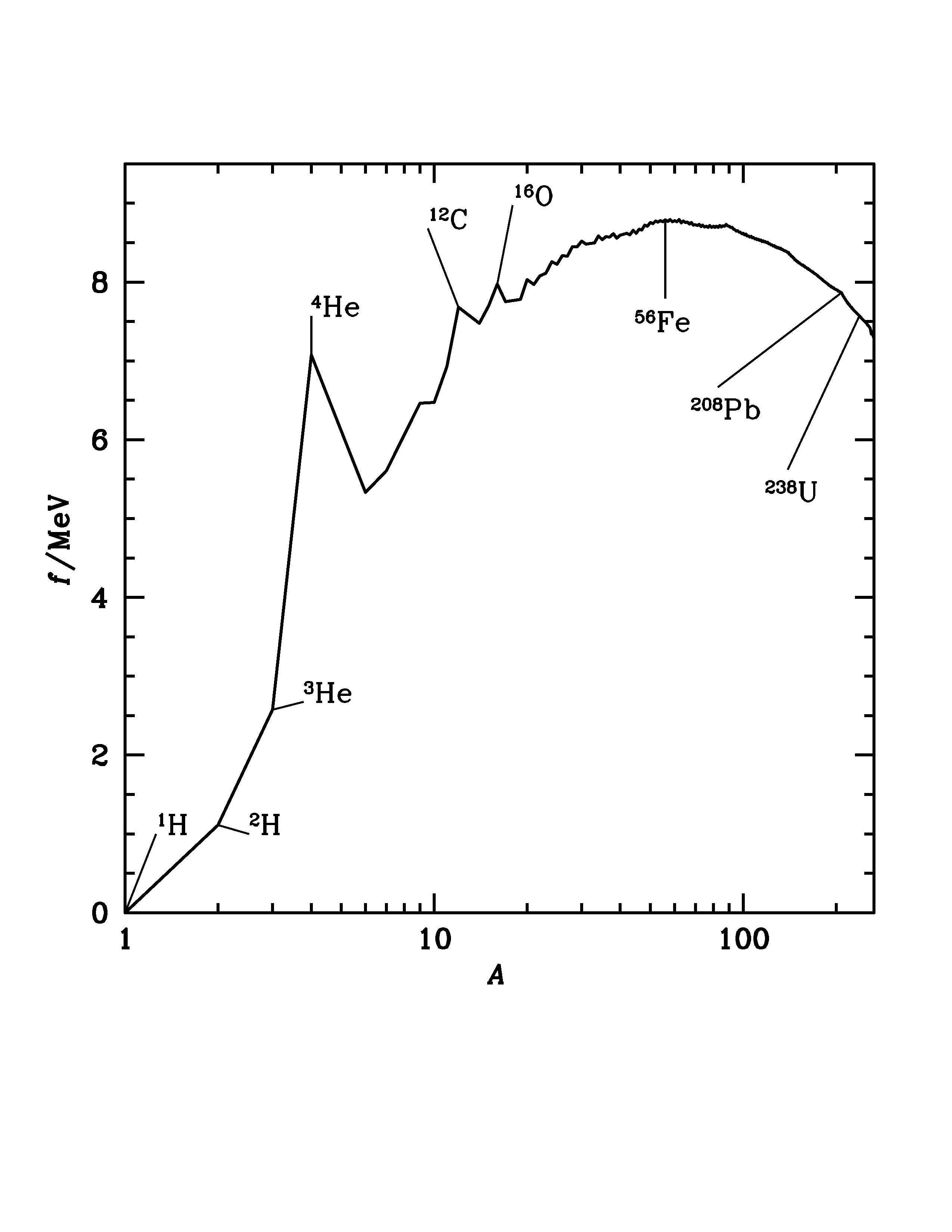 Fig. 2.35 The binding energy per nucleon \(f\) for the most stable isotope of each atomic weight \(A\). Iron-56 occupies the site of the most stable nucleus. Energy can be obtained by fusion of nuclei of lower atomic weight or fission of nuclei of higher atomic weight. Notable peaks occur appear for helium-4, carbon-12 and oxygen-16. Lead-208 is the heaviest non-radioactive nucleus.#