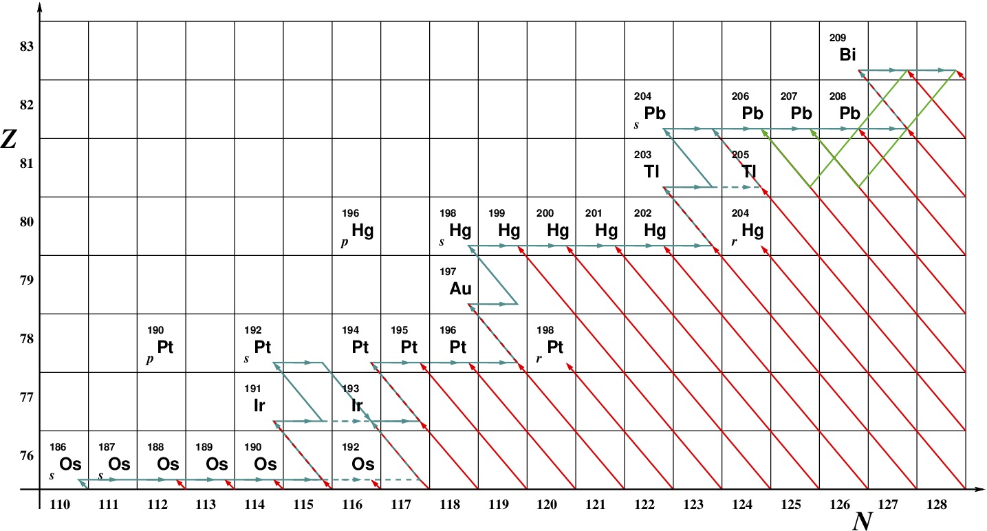 When the neutron flux is much larger neutrons are captured until nuclei reach the neutron drip line beyond which no more can be accommodated. Once the neutron flux falls off these heavy nuclei rapidly \(\beta\)-decay back to the valley of stability. This \(r\)-process is responsible for elements heavier than \(^{208}\)Pb as well as a characteristic set of lighter isotopes. Europium, molybdenum and uranium are all typical products. The site of the \(r\)-process appears to be merging neutron stars.