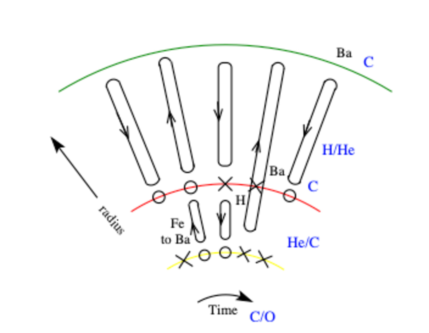 There are also some proton-rich isotopes that are protected by stable nuclei from both the \(s\)- and \(r\)-processes. These tend to be rare, making up only a tiny fraction of the terrestrial isotopic mix of a given element, and their site of production remains an interesting topic of research. One possibility is Thorne–.Zytkow objects, hypothetical giants with neutron star cores. Accretion on to the core drives a deep convective envelope the base of which is hot enough for heavy nuclei to capture protons. The resulting nuclei are rapidly whisked back to the surface so the burnining is interupted.