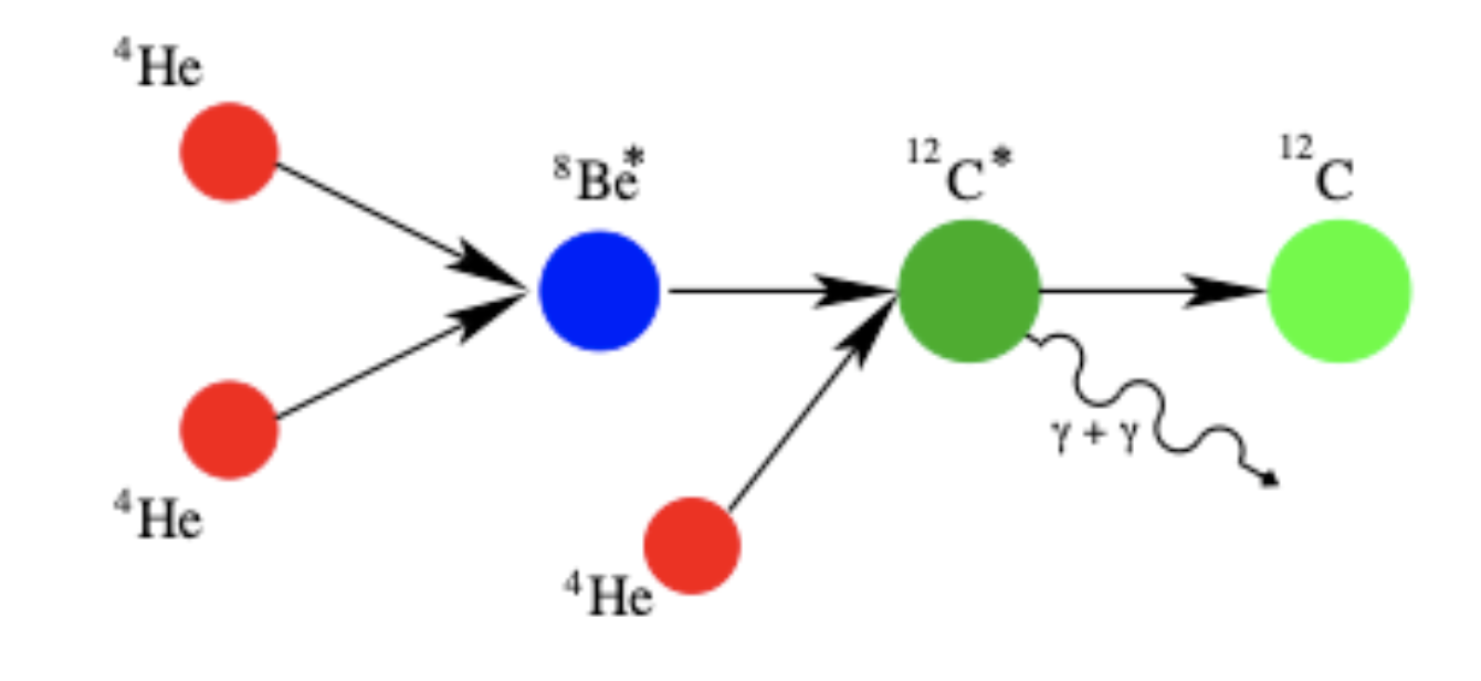 \(\rm {^8Be}^* + {^4He} \buildrel\leftarrow\over\rightarrow {^{12}C}^*,\)