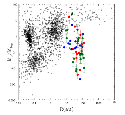 Fig. 2.43 Comparison of orbital properties of exoplanets around mature stars (black) and those inferred in protoplanetary discs from the presence of ring-like substructure. (Credit: G. Lodato).#