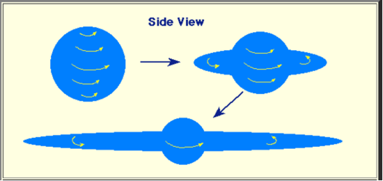 Consequently there comes a point where collapse in the plane perpendicular to the rotation axis is halted. No such effects halt collapse parallel to the rotation axis. Consequently, an initially spherical core will collapse and form a centrifugally supported disc.