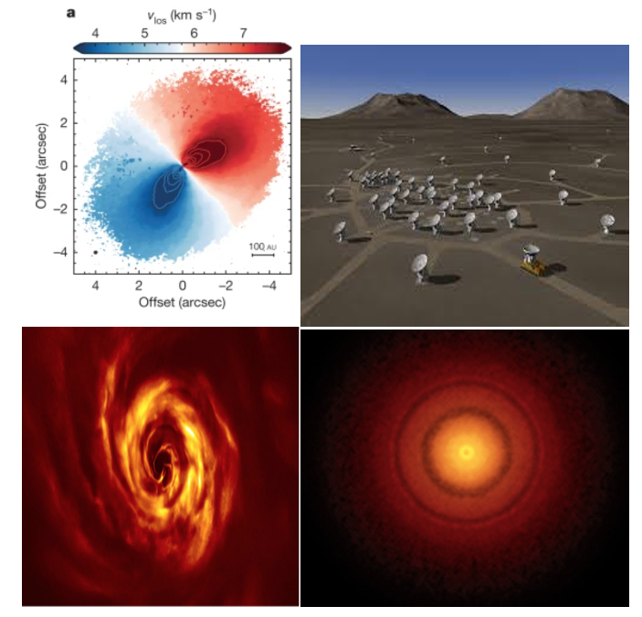 Fig. 2.42 Top left : velocity map measured with ALMA for disc in HD 163296 (Credit R. Teague). Top right: the ALMA array. Lower Left: The disc in AB Auriga measured in scattered light with the Very Large Telescope (VLT) of the European Southern Observatory (ESO) (Credit A. Boccaletti). Lower right: ALMA image of ring-like sub-structure in TW Hydra (Credit S. Andrews).#