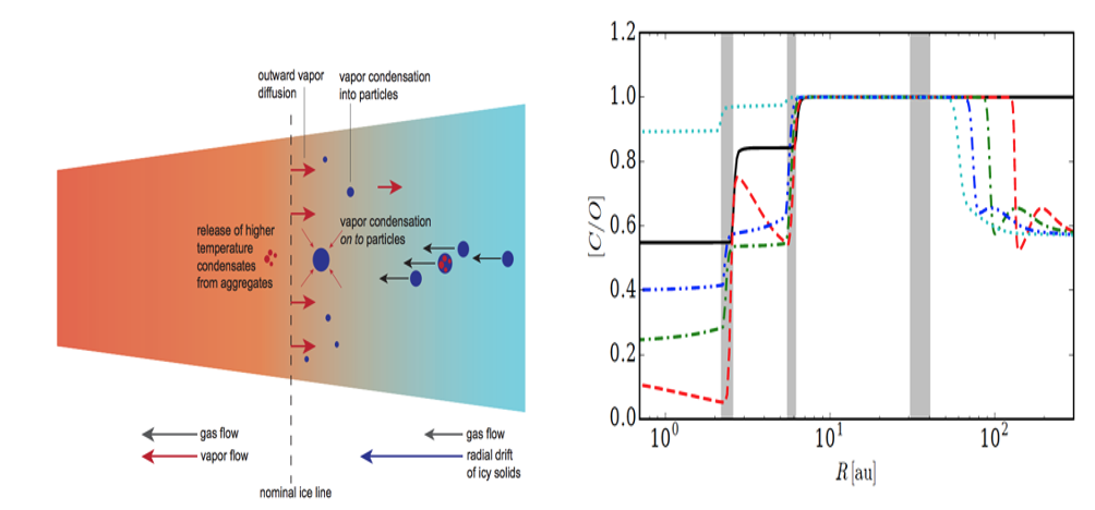 Fig. 2.47 Left panel: schematic of how the concentration of species in the gas is affected by radial drift of ice bearing solids across snowlines. Right panel: the evolution of the resulting C/O ratio in the gas according to chemodynamical modeling (Credit R. Booth).#