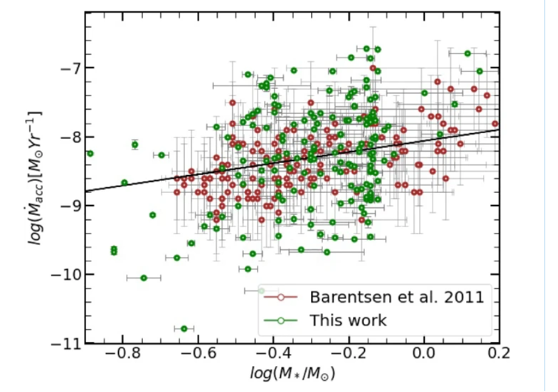 Fig. 2.46 Some observational determinations of the accretion rate of gas on to the star as a function of stellar mass, inferred from the luminosity generated when accreting gas impacts the stellar surface. (Credit S. Nidhi).#