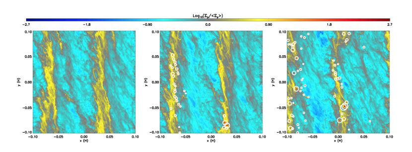 Fig. 2.50 Simulations of the streaming instability in a dust rich protoplanetary disc, colour coded according to local dust to gas ratio. The white circles indicate where dust has collapsed into planetesimals. Credit: J. Simon.#