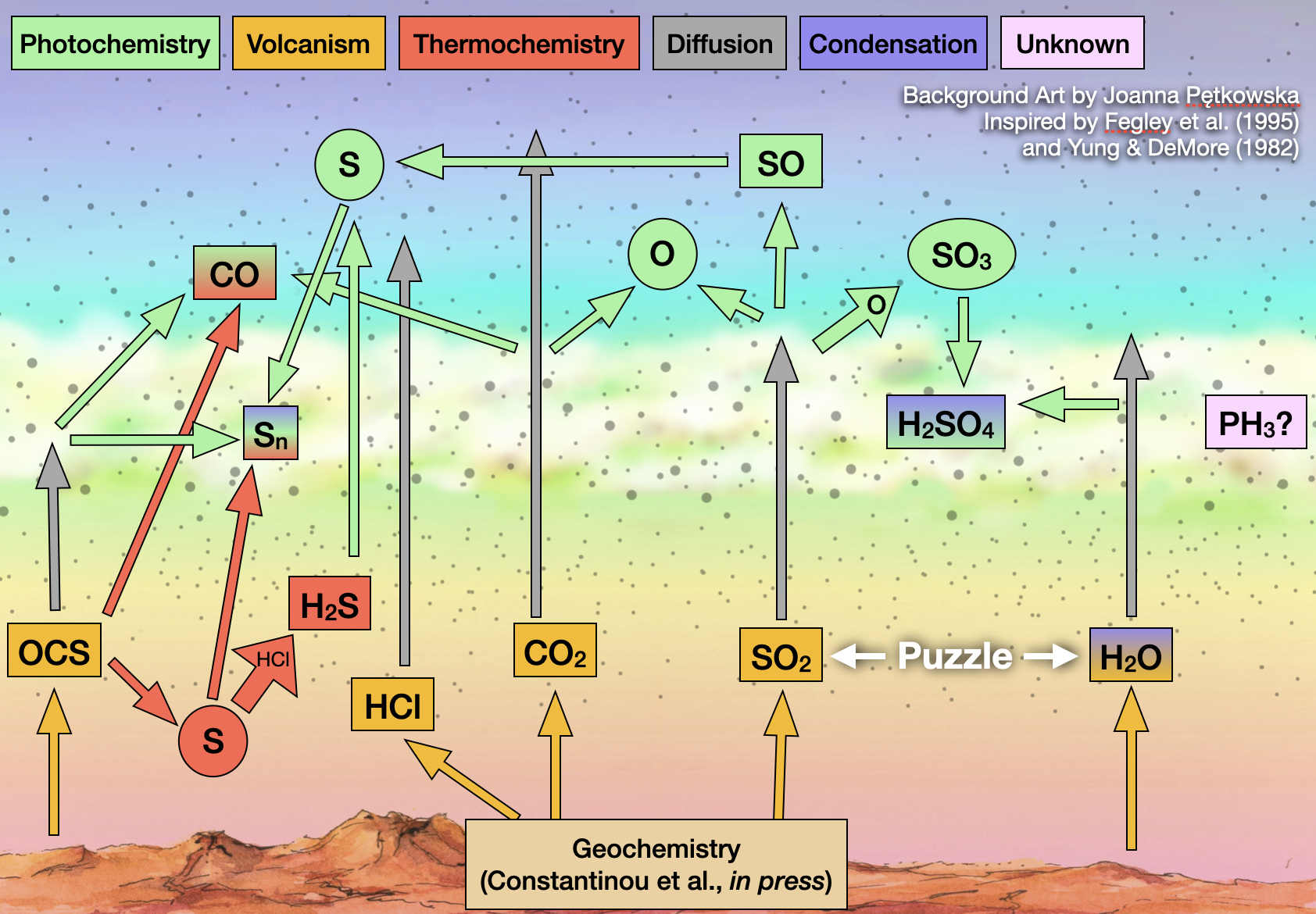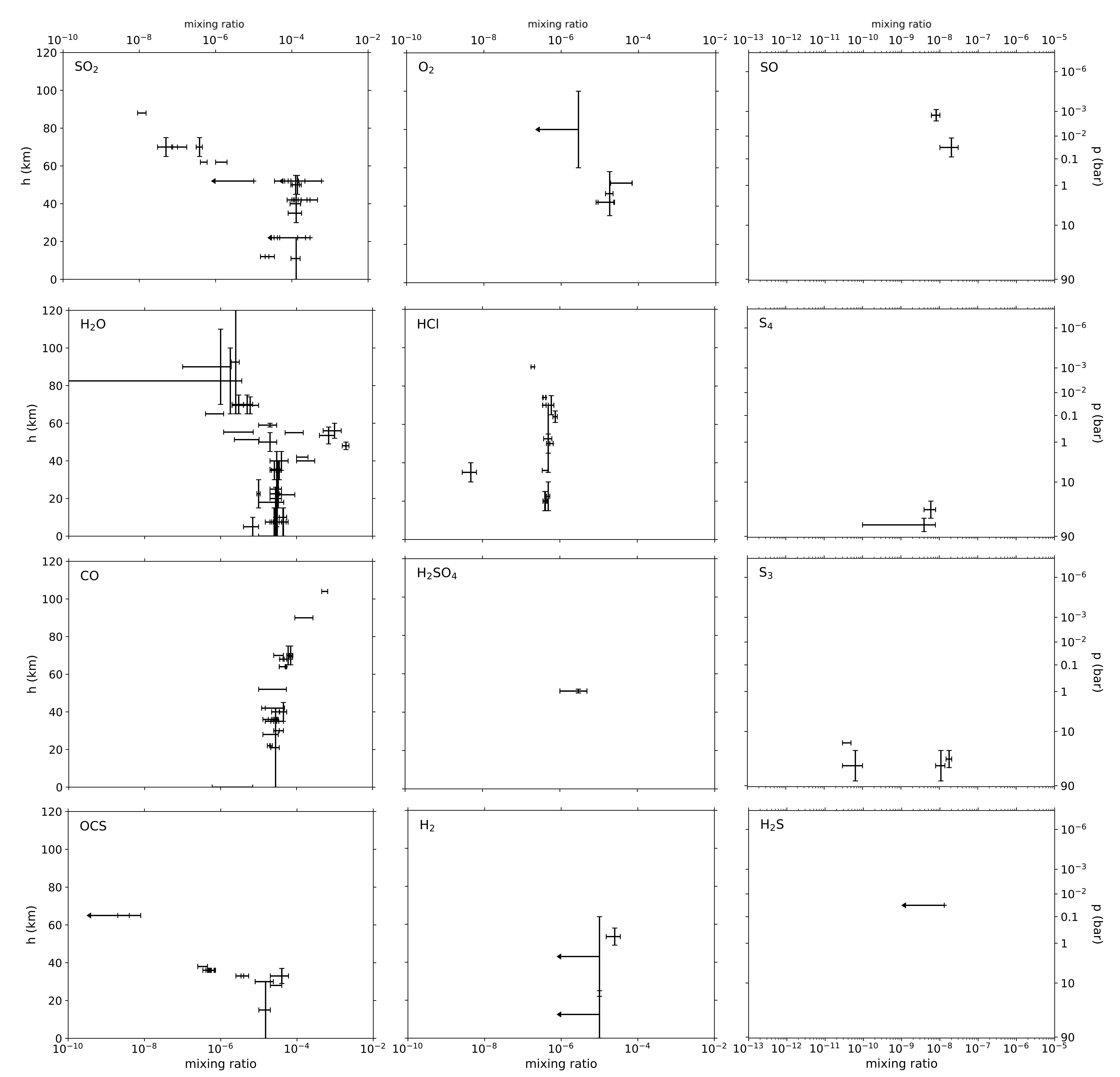 Loss of OCS below the clouds. Some unknown chemistry needs to be going on to remove OCS and restore CO at 35 km. This mystery was first noticed by Yung et al. (2009).Yung et al. propose some mystery species X to convert OCS to CO, but it’s not clear what this X could even be. Bierson & Zhang (2020) talk about some possibilities.