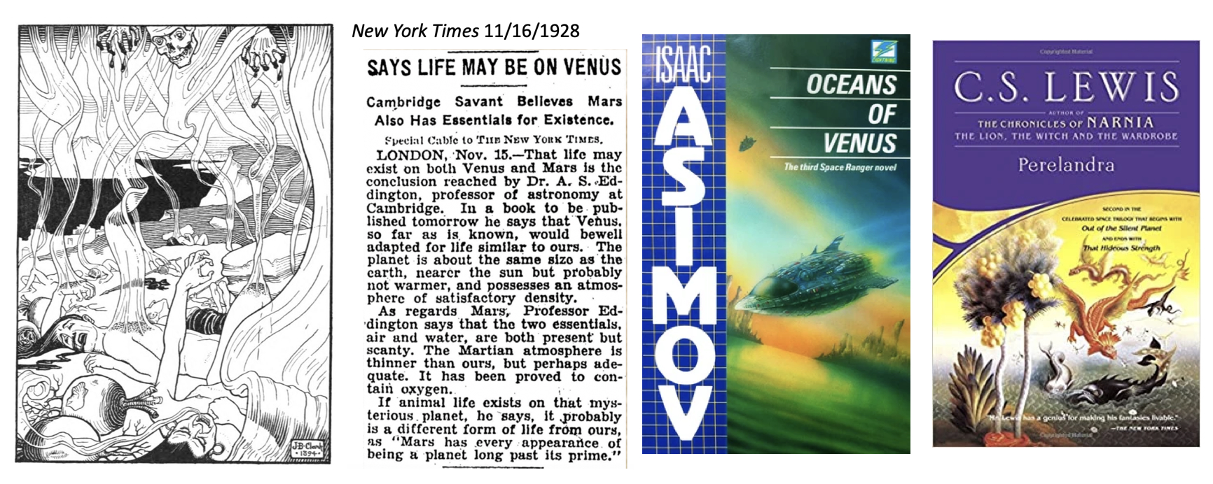 Fig. 3.78 Speculation about Life on Venus. From giant extraterrestrial turnips hurled from the Moon onto Venus to defeat the Sun’s warriors with their terrible stench, to the New York Times article about the temperate surface of Venus, to two novels about life on Venus: Asimov’s “Lucky Starr and the Oceans of Venus” and C.S. Lewis’s “Perelandra”.#