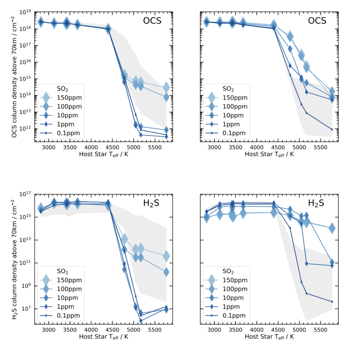 Fig. 3.89 OCS and H\(_2\)S Survival on Exo-Venus When Venus is placed around cooler stars, the sulfur species H\(_2\)S and OCS survive at much higher abundances, above the clouds. They may be observable with future telescopes, and would indicate the presence of a Venus-like atmosphere, albiet an atmosphere with different photochemistry, due to its different host star. From Jordan et al. (2021), their Figure 10.#