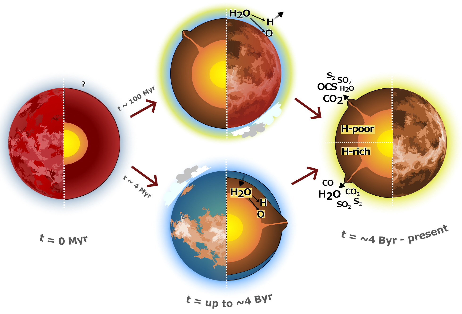 Trajectory 2: Maybe Venus had a lot of water, but lost it very early on. This is effectively the scenario proposed by Turbet et al. (2021), though their scenario would also be consistent with our Trajectory 1. Venus quickly underwent a greenhouse runaway, due to its proximity to the Sun, and enhanced by the formation of clouds preferentially on the night side, allowing the sunlight to get deep into the atmosphere and then trapping the heat on the night side. Mystery: If Venus lost so much of its H\(_2\), it lost a lot of reducing power, and the leftover O\(_2\) should have oxidized the surface and atmosphere considerably. But Venus’s atmosphere is, if anything, a bit reducuing. Almost all the constituents of Venus’s atmosphere have a redox value of 0, or slightly positive. OCS has a redox value of +3, and CO of +1, and these are the most abundant constituents of Venus’s atmosphere with a non-zero redox value. What happened to all the oxygen? Where did it go, and what did it oxidize?