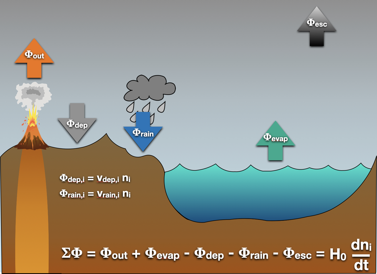Fig. 3.86 Atmospheric Sources and Sinks. Here we take into account various sources and sinks for the atmosphere. We have a bunch of fluxes, \(\Phi\), all with units of cm\(^{-2}\) s\(^{-1}\). There’s the sources: outgassing (\(\Phi_{\rm out}\)), evaporation (\(\Phi_{\rm evap}\)). And the sinks: rainout, or wet deposition (\(\Phi_{\rm rain}\)); dry deposition (\(\Phi_{\rm dep}\)); and escape (\(\Phi_{\rm esc}\)). Of all of these, escape alone involves completely removing something from the system. The rest may count as effective removal, but are thought to leave the global state of the planet unaffected.#