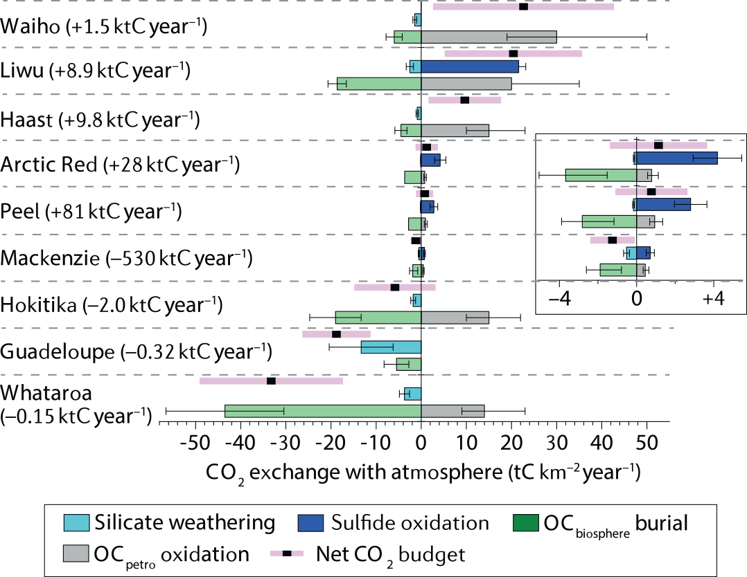 In some large catchments, such as the Peel River (Canada), it is now thought that more \(\sf CO_2\) might actually be released than is consumed via weathering,