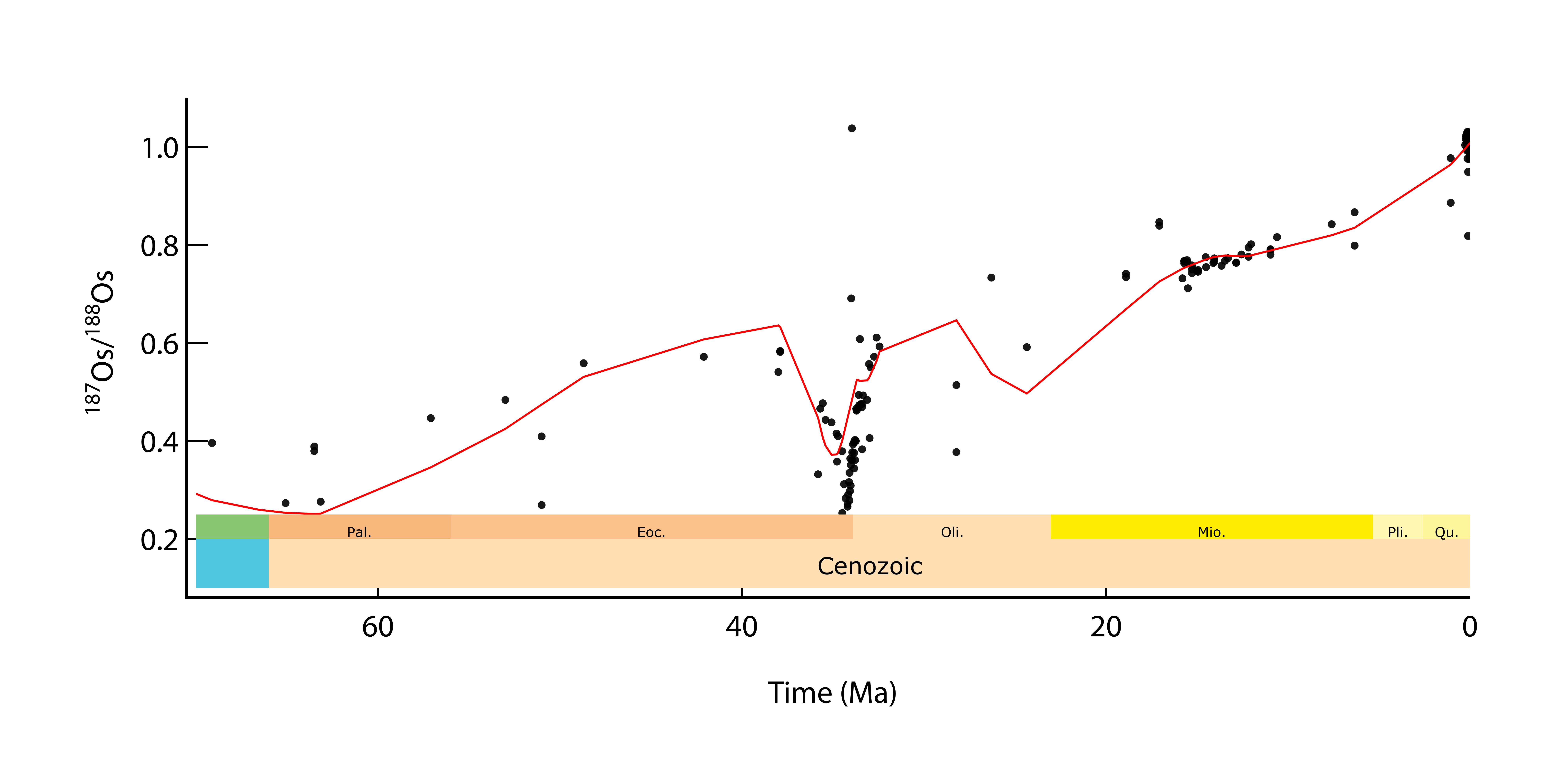 Other tracers of the long term carbon cycle have emerged in the last 20 years, such as the radiogenic osmium (Os) isotope system. \(\sf ^{187}Re\Rightarrow^{187}Os\) with a long half life of 41.6 Ga. Osmium is extremely dilute in natural waters, but is present as \(\sf ^{187}Re\), and as such have a low \(\sf \frac{^{187}Os}{^{188}Os}\) isotope ratio. Organic rich rocks and sulfide minerals (common in organic rich rocks) are enriched in \(\sf ^{187}Re\) and as such have a high \(\sf \frac{^{187}Os}{^{188}Os}\) isotope ratio. There is therefore optimism that the \(\sf \frac{^{187}Os}{^{188}Os}\) isotope ratio may be used to trace the amount of petrogenic organic carbon oxidation over geological time. Interestingly there is a notable increase in the marine record of the \(\sf \frac{^{187}Os}{^{188}Os}\) isotope ratio over the last 35Myr. Is this related to organic carbon oxidation associated with the rise of the Himalaya?