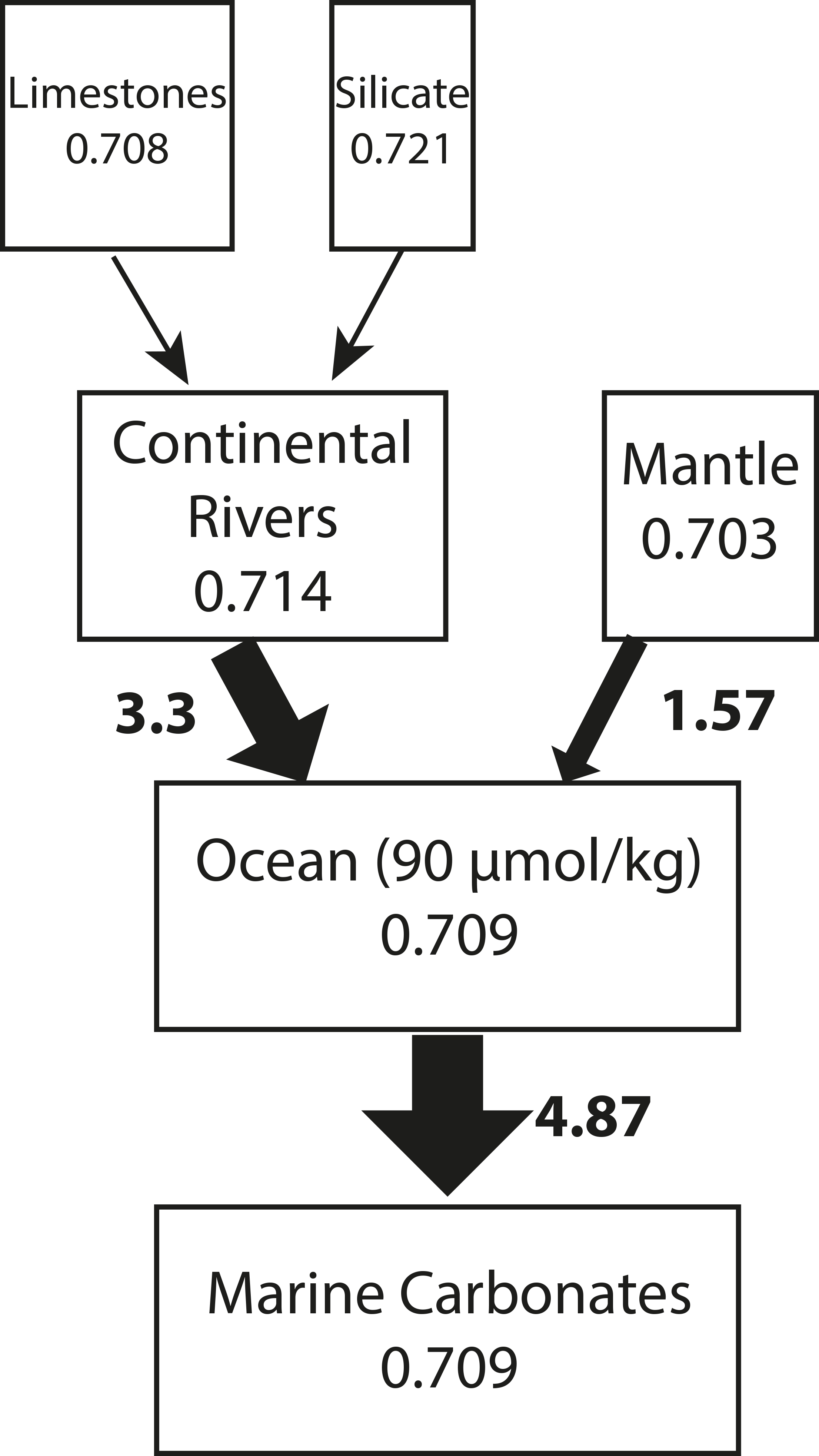 where \(\tau\) is the residence time, \(\sf N_{sw}\) is the total mass of an element in seawater, and \(\sf J_{out}\) is the removal flux of Sr from seawater (into marine carbonates). Sr has a long residence time, of several million years, much greater than the mixing time of the oceans (ca. 100 years). This means that both the concentration and isotope ratio of Sr is constant in seawater, no matter where the water is sampled. This also means that the Sr isotope budget of seawater through time can be conceptualised as a 1-box model: