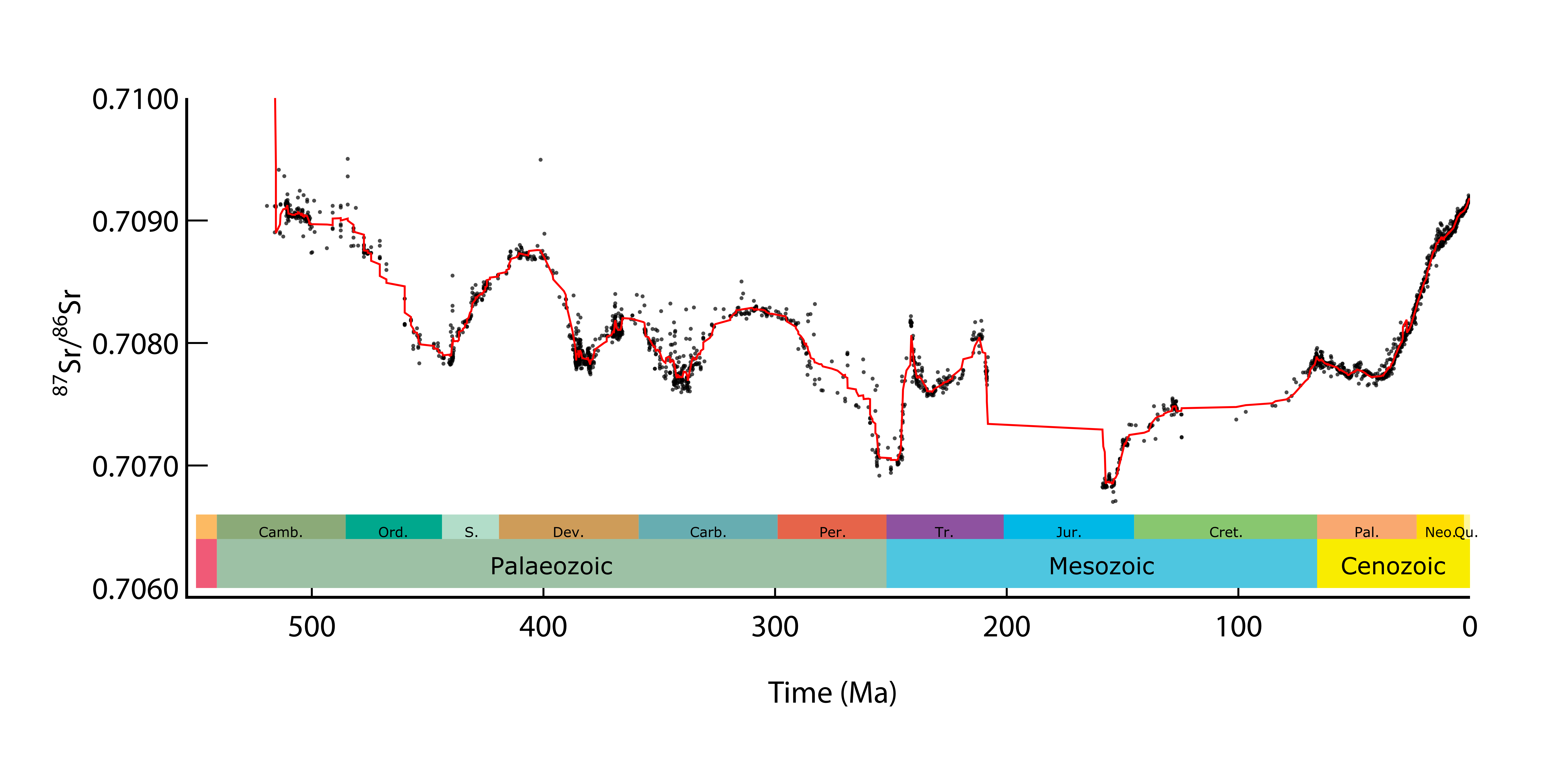 Sr isotopes in marine carbonates over both the Phanerozoic and the Cenozoic show one of the most elegant geochemical records. Presumably they demonstrate a tectonic control on seawater chemistry over time, and hence Earth’s environment.