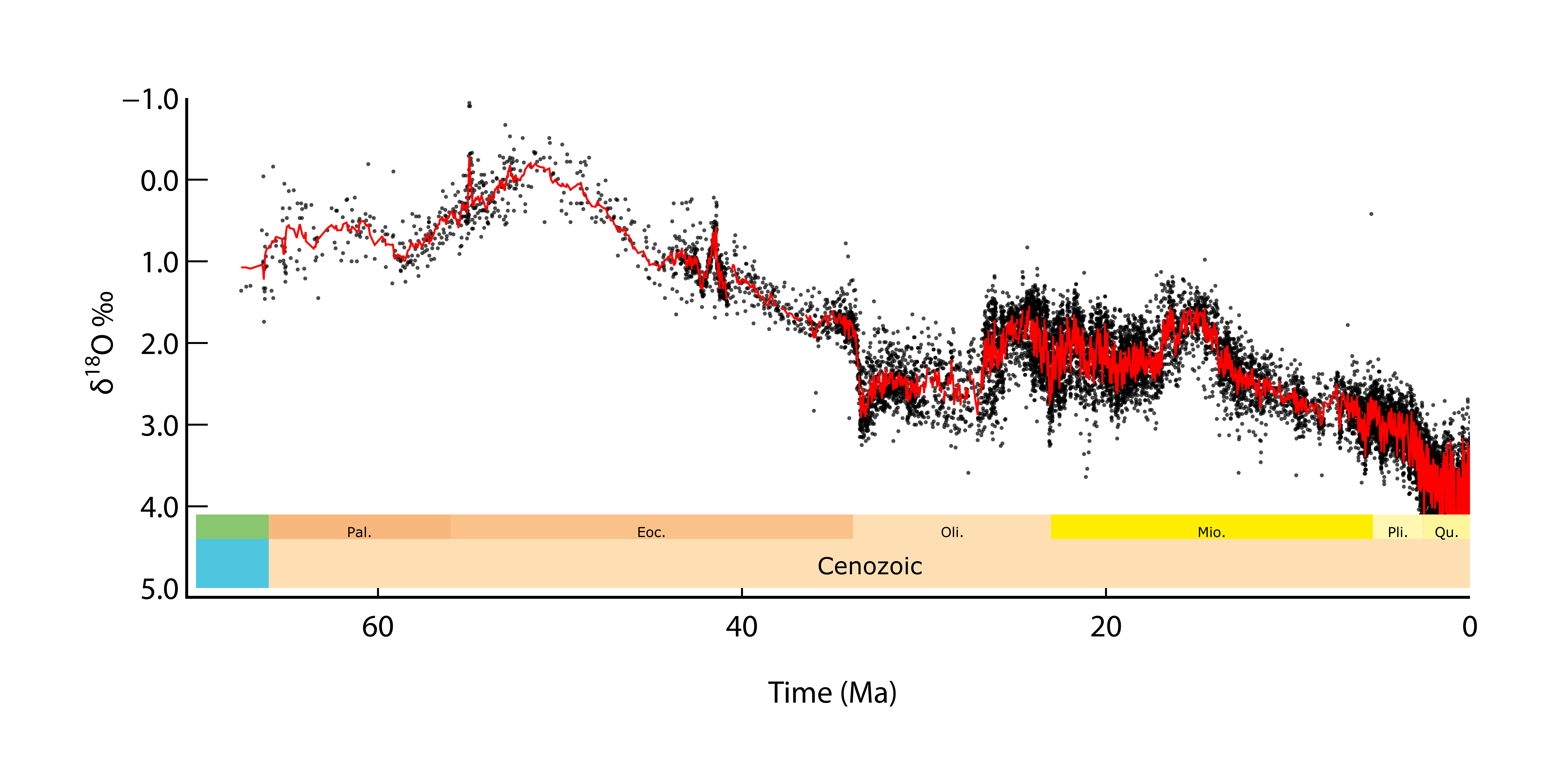 Fig. 3.26 The Cenozoic record of \(\sf \delta^{18}O\) in foraminiferal calcite, replotted from Zachos 2001. Note the reverse scale, such that \(\delta^{18}O\) varies in the same direction as T when plotted like this.#