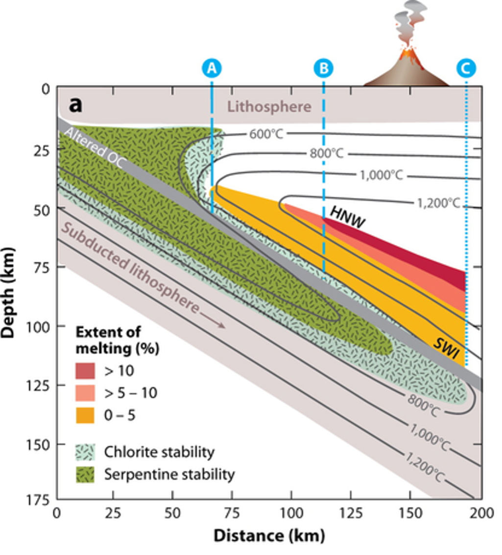 As the slab heats up, serpentine (and other hydrous minerals) becomes unstable. The depth at which this occurs depends on the thermal state of the subduction zone (i.e. on convergence rate, age of the downgoing slab and slab dip). If the fluids are released into a suitably hot part of the mantle wedge, then hydrous melting can occur (whereby the solidus is lowered by adding the hydrous fluids).