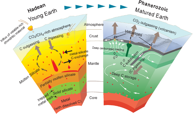 Fig. 3.58 Cartoon depicting various possible processes that may have occurred in early in Earth’s history to the those occurring today, such as plate tectonics, and the effect on volatile elements and atmospheric composition. Dasgupta, 2013.#