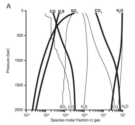 Fig. 3.57 Evolution of volcanic gas composition with pressure in a closed system at 1000 C for basalt. Bold and thin lines are outputs from two slightly different models, outlined in Burgisser et al., 2015.#