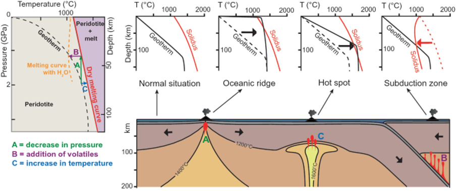 Fig. 3.54 Mechanisms of melting at different tectonic settings. The solidus (red) is the temperature at which the mantle begins to partially melt. The geotherm (black) is the ambient temperature of the mantle, and tends to increase rapidly with depth through the lithosphere, and less rapidly through the asthenosphere. Melting can be triggered by decompression (e.g. at mid-ocean ridges), by adding water (at subduction zones), by increasing the mantle temperature (e.g. associated with mantle plumes).#