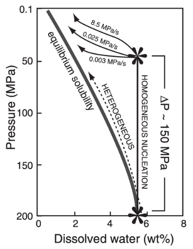Fig. 3.55 Silicate melts degas water as they decompress, as the solubility of water in silicate melts decreases with pressure. The presence of bubbles increases magma buoyancy and accelerates magma towards the surface. If crystals are present, bubbles tend to grow on them (heterogeneous nucleation). If the melt is crystal-free, bubbles may be inhibited energetically, leading to supersaturation and homogeneous nucleation.#