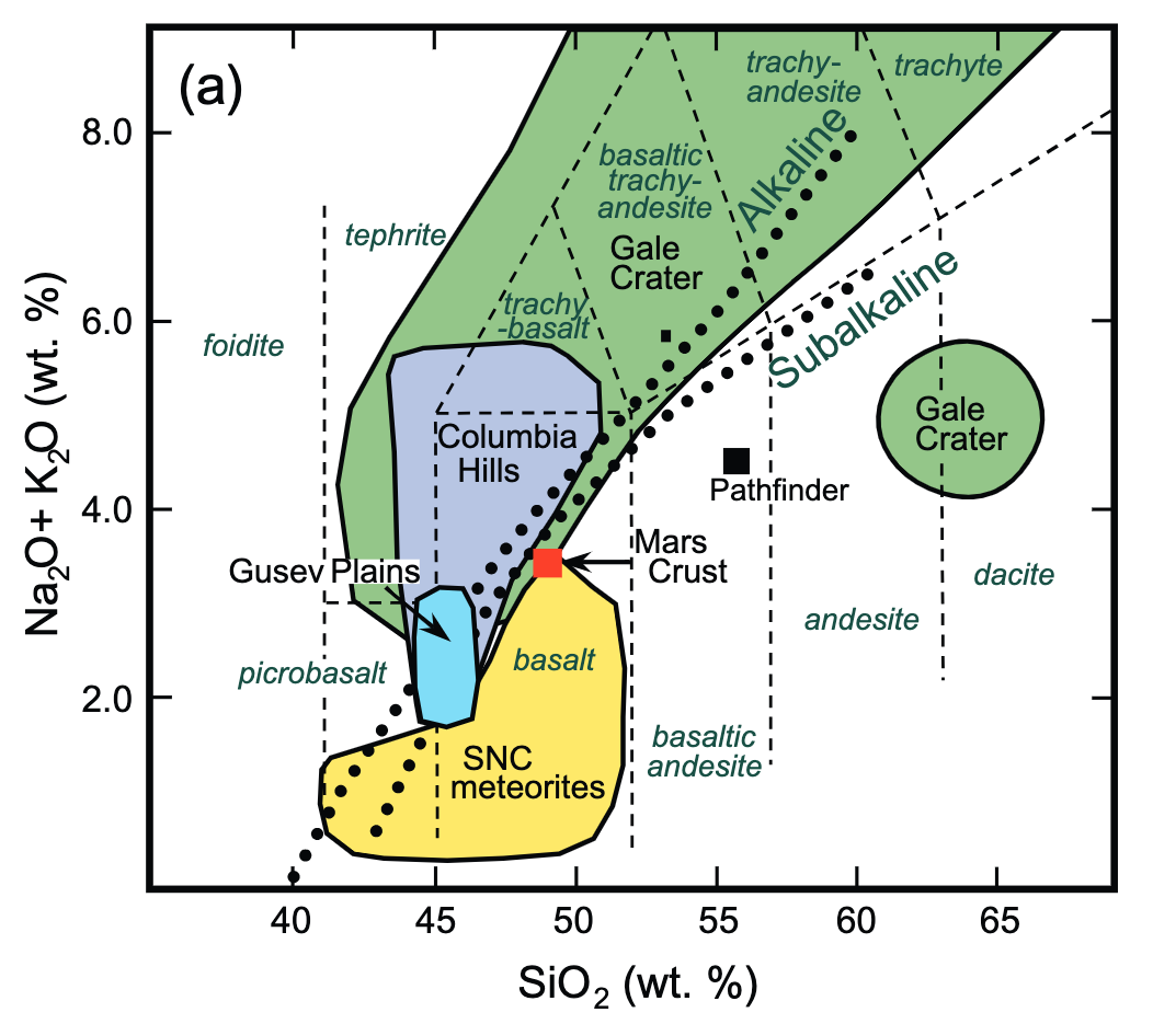 Fig. 3.62 A plot of (Na2O + K2O) versus SiO2 showing the range of igneous compositions observed on the surface of Mars by various rovers, and in the bulk composition of Martian meteorites. An estimate of the average composition of the Martian crust is also shown. Credit: McLennan (2022) Chapter 8. Composition of planetary crusts and planetary differentiation, in: Planetary Volcanism Across the Solar System. 287–331.#