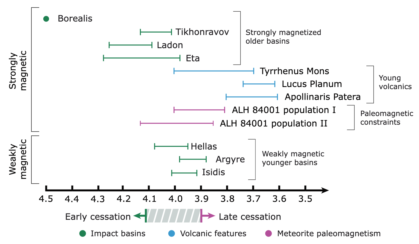Fig. 3.61 Summary of constraints on Mars’s magnetic history. The longevity of the Martian dynamo is inferred from magnetically characterised impact basins (green), young magnetised volcanics (blue), and paleo-magnetic analysis of the ALH84001 meteorite (pink). Although some large basins formed after 4.1-4.0 appear demagnetised, young volcanics and ALH84001 may require an active dynamo as late as 3.6Ga. Credit: Steele et al. (2024) Nature Communications, 15, 6831.#