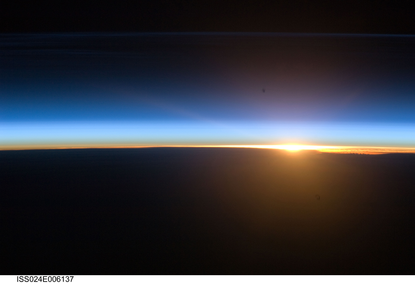 Fig. 4.1 Life has transformed the chemistry of Earth’s atmosphere, changing its very colour. Here we see the blue light of Earth’s limb from its stratospheric ozone layers. Image credit: Image Science & Analysis Laboratory, NASA Johnson Space Center.#