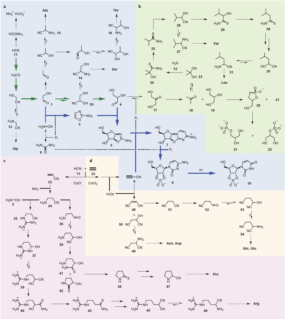 Patel, B.H., Percivalle, C., Ritson, D.J., Duffy, C.D. and Sutherland, J.D., 2015. Common origins of RNA, protein and lipid precursors in a cyanosulfidic protometabolism. Nature chemistry, 7(4), pp.301-307.