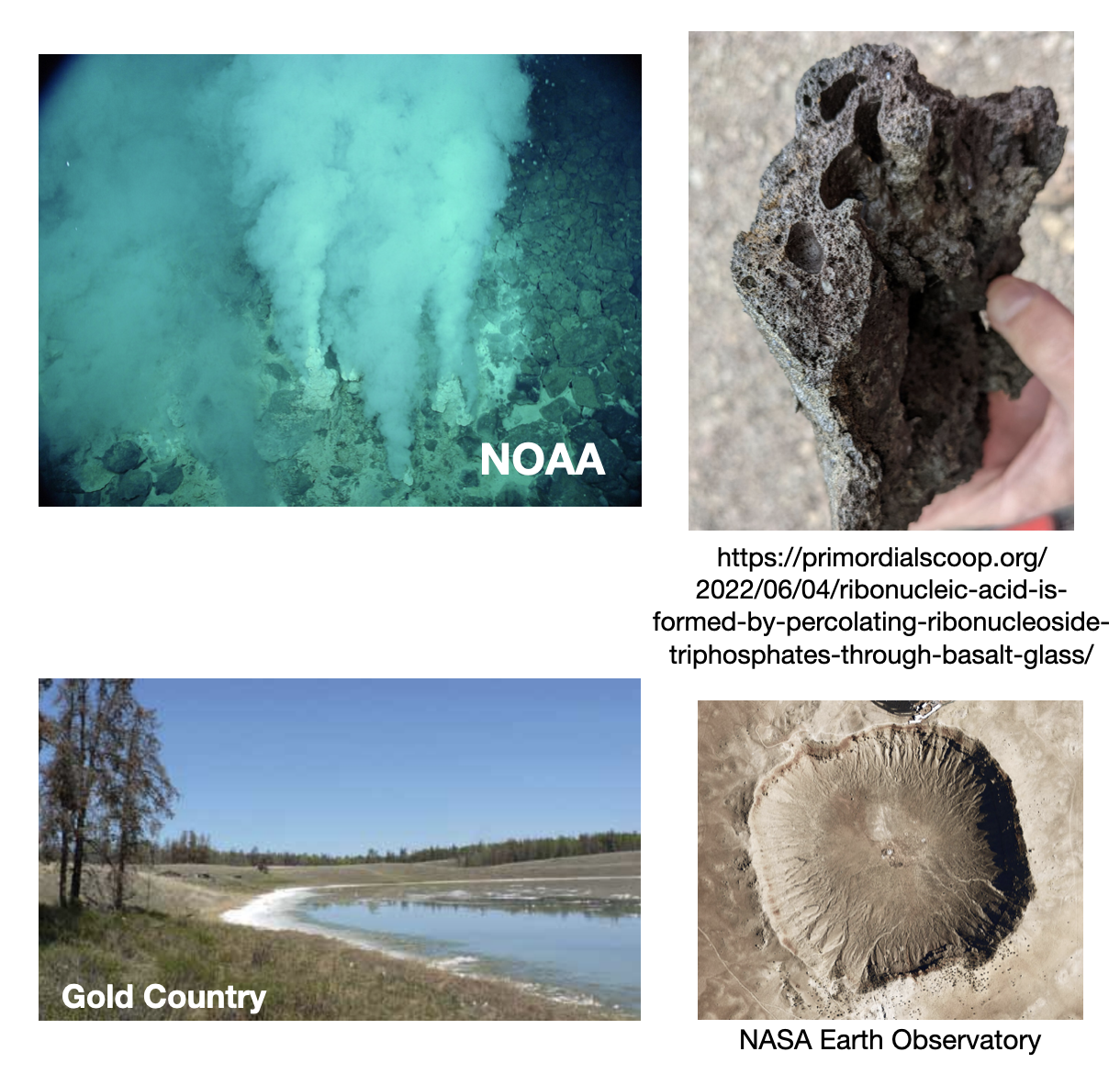 Fig. 4.81 For Example Environments where Life may have Originated: Shown here is the Champaign Alkaline Hydrothermal Vent, a Basaltic Rock, a Phosphate-Rich Alkaline Lake, and an Impact Crator.#