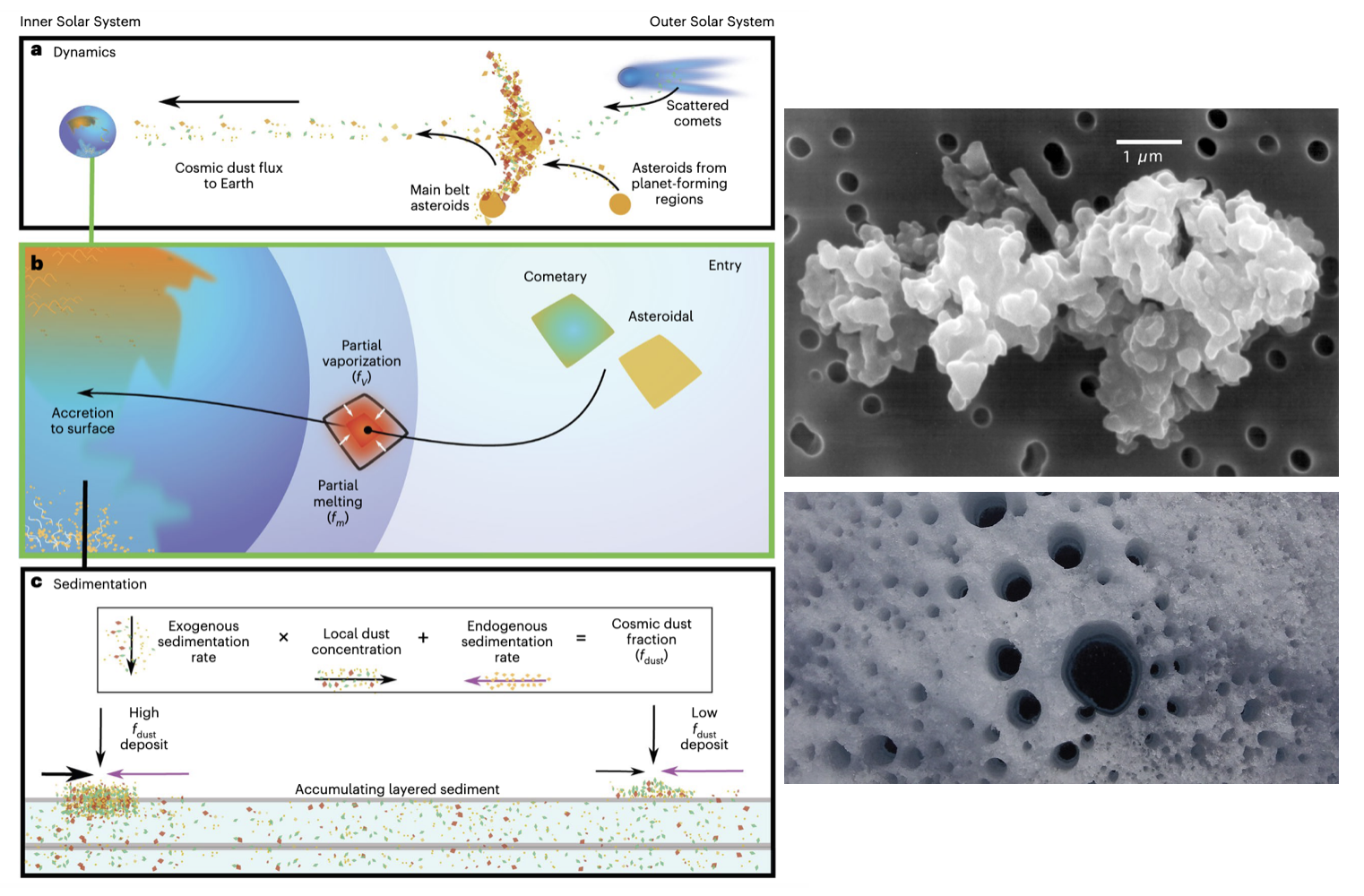 Fig. 4.76 Delivery of Volatiles via Interplanetary Dust: An illustration showing, by calculation, that roughly 50% of interplanetary dust grains arrive on Earth’s surface intact, along with photographs of what happens when this material ends up on pristine long-lived ice, how it can lead to little pockets of melted material. From Walton et al. (2024).#