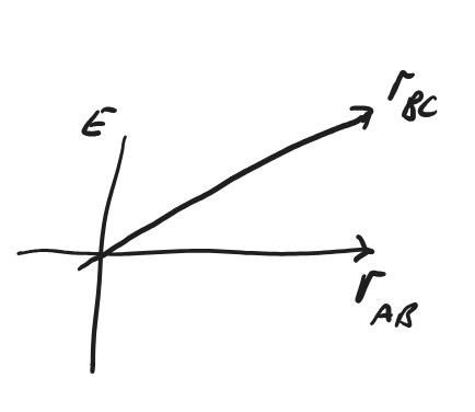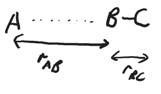 To understand what occurs during a chemical reaction we can look at the energy of the combined system of reactants as a function of the positions of the atoms. Even in our three-atom, two molecule system, that is far too many degrees of freedom to plot, so we will consider the simple case of one dimension, where A, B, and C are collinear, with distances, \(r_\ce{AB}\) and \(r_\ce{BC}\).