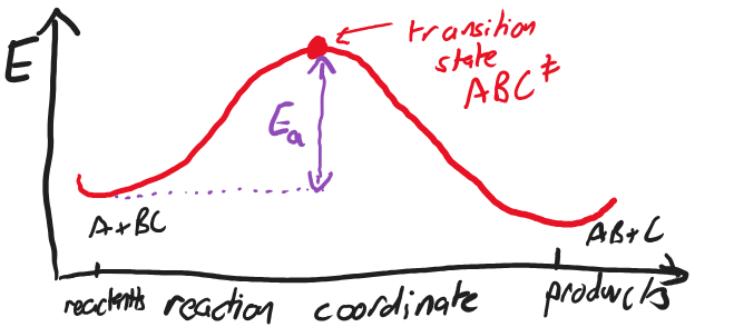 The simplest model using this concept is the Arrhenius Equation, where it is assumed that to overcome the barrier for the reaction to proceed, an Activation Energy, \(E_a\) is required. At a temperature, \(T\), the relative likelihood of gaining activation energy \(E_a\) is given by the Boltzmann Factor, \(\exp(-E_a/RT)\), and so the Arrhenius Equation is born: