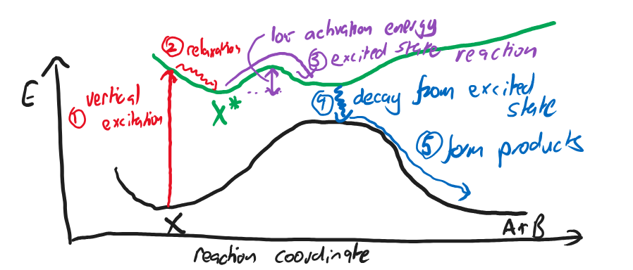 This process involves two PESes: the ground state of \(\ce{X}\) which may have a high barrier to producing \(\ce{A+B}\), and its excited state, \(\ce{X^*}\), where it’s possible that making the products is even exothermic.