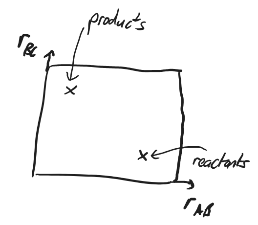 Fig. 4.38 A 2-dimensional plot of the reaction space with coordinates \(r_\ce{AB}\) and \(r_\ce{BC}\), showing the position of reactants and products.#