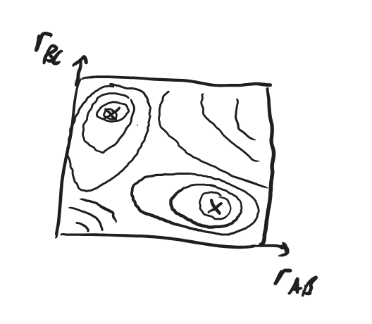 Fig. 4.37 A 3-dimensional plot of a Potential energy surface with coordinates \(r_\ce{AB}\) and \(r_\ce{BC}\) is too difficult to draw.#