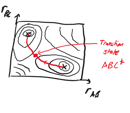 Fig. 4.40 A 2-dimensional contour plot of the energy in the reaction space with coordinates \(r_\ce{AB}\) and \(r_\ce{BC}\), showing the reactants and products as local minima joined by their reaction pathway containing the transition state \(\ce{ABC^\ddagger}.\)#