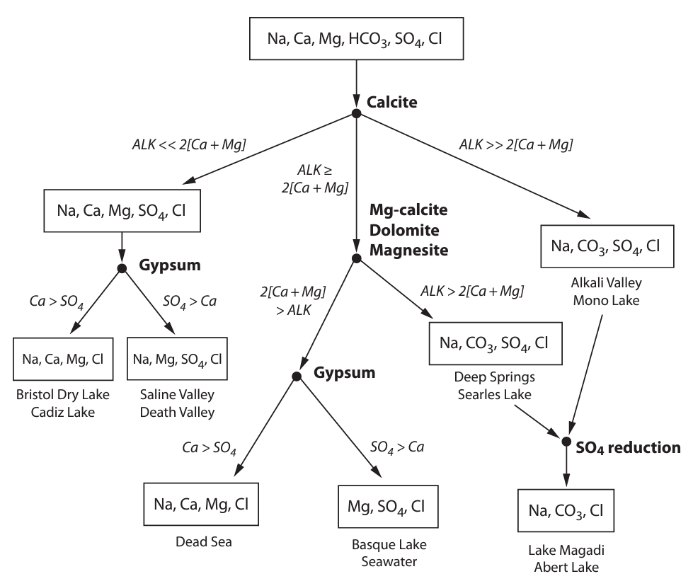 As waters continue to become extremely concentrated, their chemistry changes considerably as minerals crystallise. This results in a distinct deposit of salt minerals and brine chemistry that could vary considerably depending on the dilute water being evaporated, the concentrations of atmospheric constituents, as well as other factors.