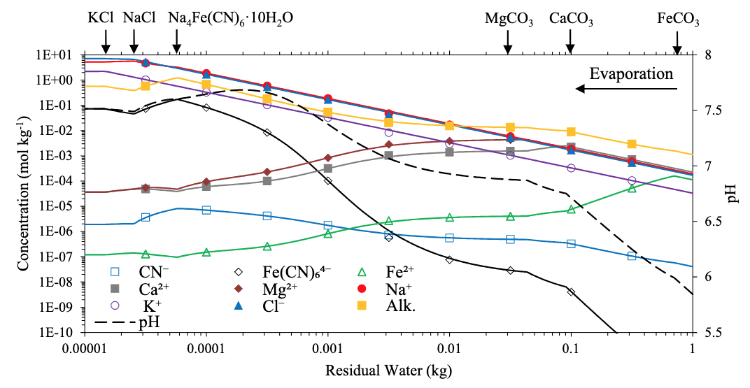 Fig. 4.71 Evaporation calculations showing the progression from a dilute surface water to a concentrated alkaline brine under atmospheric conditions relevant to the prebiotic Earth. As evaporation progresses (from right to left), major minerals are formed, including unusual ferrocyanide salts which are thought to play an important role in concentrating cyanide for later prebiotic synthesis reactions. From Toner & Catling (2019).#