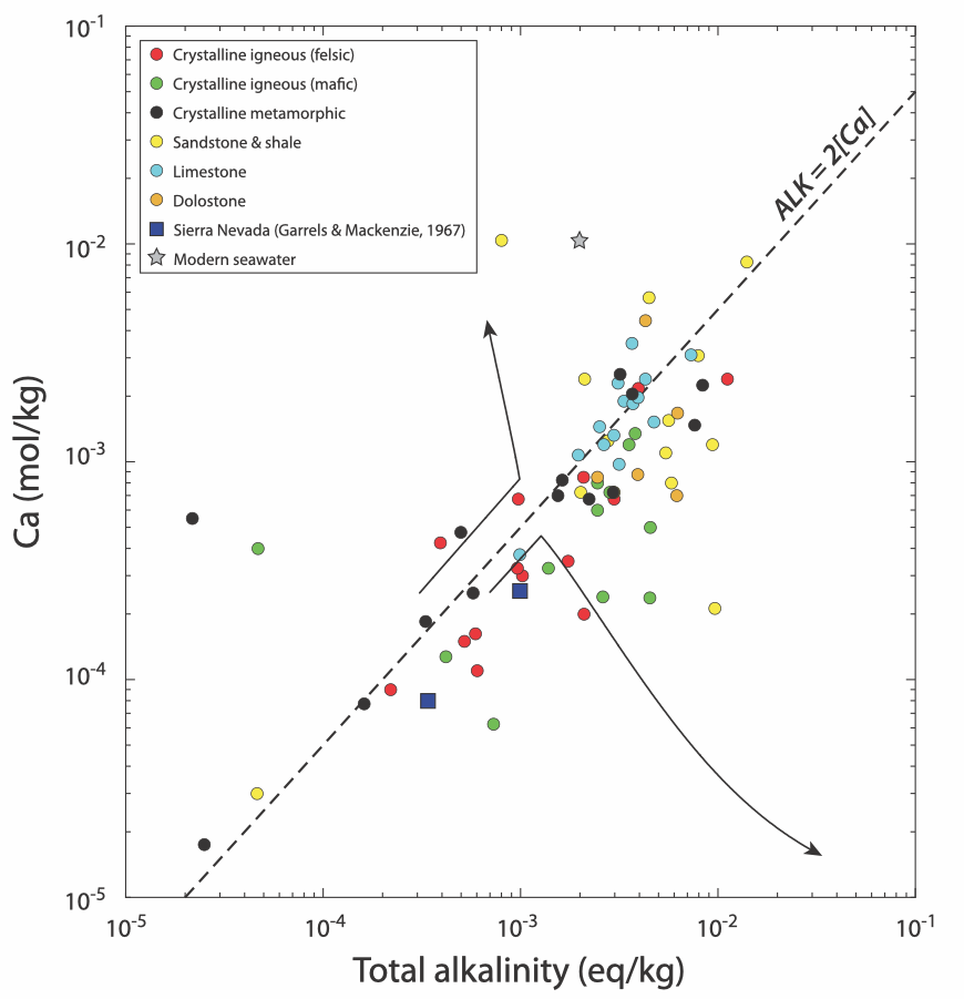 The chemical weathering of a large variety of different rocks and soils means that only certain types of waters fulfill this criterion. This is because as chemical weathering proceeds and minerals dissolve, pH increases which results in the transfer of gaseous CO\(_{2}\) to the solution, which results in alkalinity production. However, the amount of Ca\(^{2+}\) released may vary considerably depending on the type of minerals present.