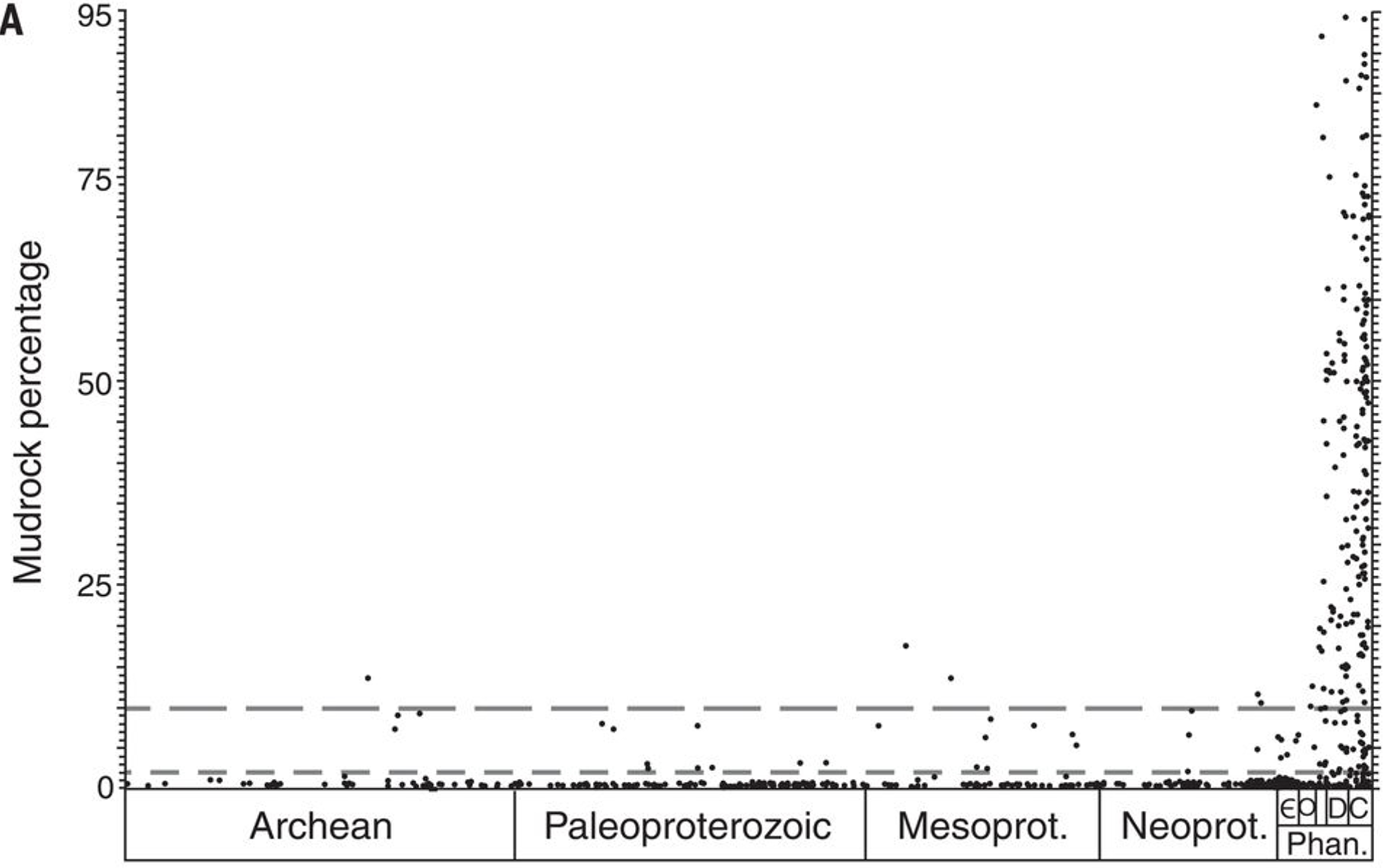 Fig. 5.52 The proportion of mud in sedimentary successions over time. From McMahon & Davies (2018).#